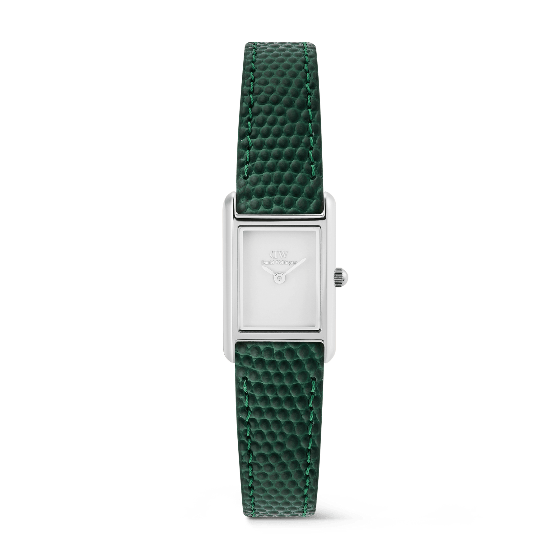 The Bound Mini Green Lizard Silver designed as part of the Bound collection for those who favor a refined, compact profile. A crisp rectangular case in silver frames a clean white dial, creating a quiet statement that feels modern and timeless. The petite silhouette sits light on the wrist and complements minimal style.The green, lizard-embossed genuine leather strap adds depth and a subtle touch of color. Finished with a polished pin buckle, it pairs effortlessly with tailored looks and relaxed outfits alike. Its rectangular shape, white dial, and green leather offer a distinctive yet versatile combination that feels personal and considered. Crafted from 316L stainless steel and finish it in polished silver for lasting clarity. A reliable Japanese quartz movement keeps everyday time with precision. The genuine leather strap is carefully cut, embossed, and stitched for comfort and durability. Every detail is refined to serve daily wear and special moments.