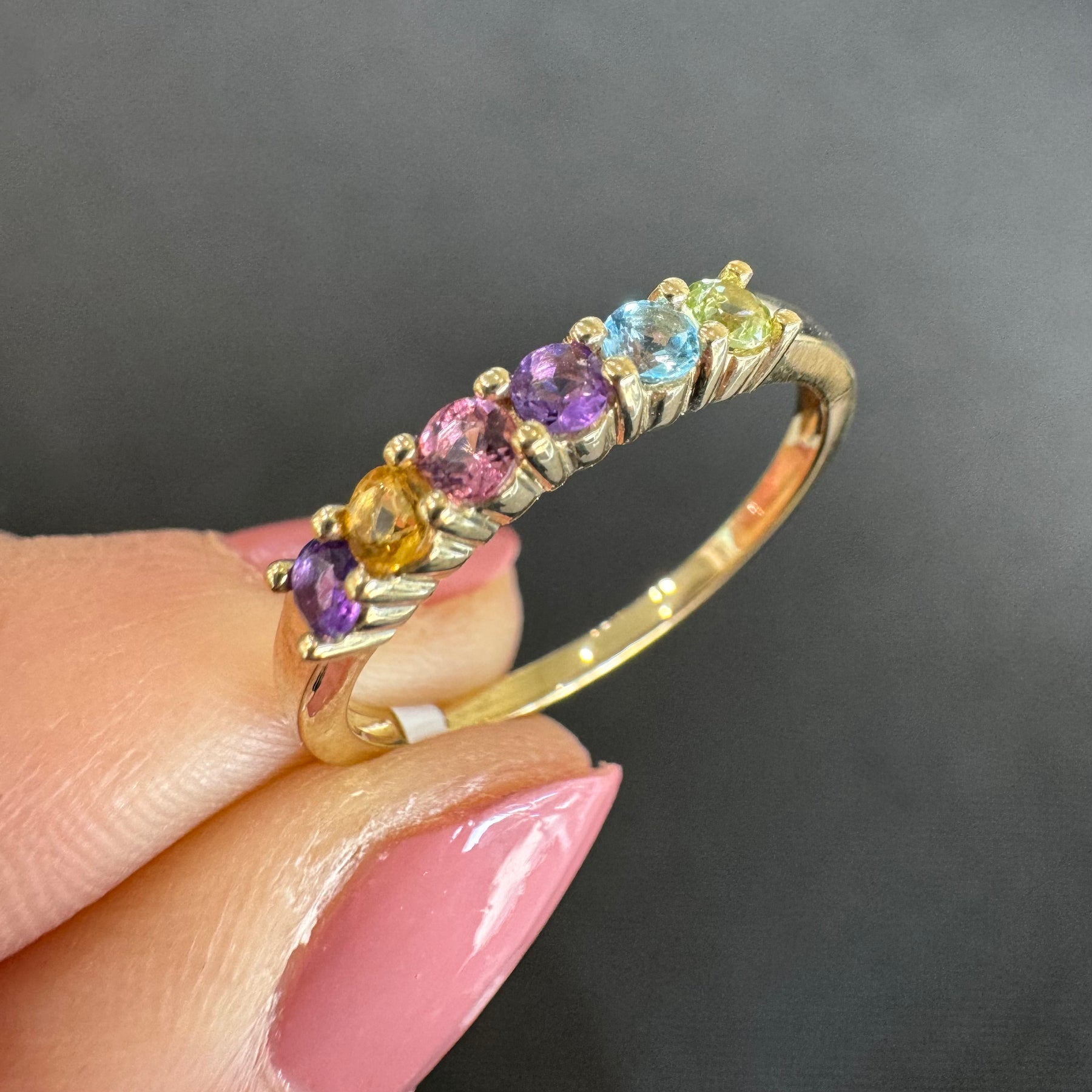 - Peridot, Blue Topaz, Pink Tourmaline, Amethyst, Citrine